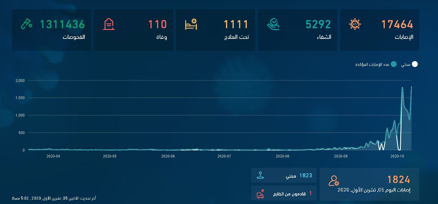 كما زاد عدد المصابين الذين يتلقون العلاج داخل مستشفيات المملكة ليصل إلى 1111 مصاباً، فيما سُجل 5292 حالة شفاء.