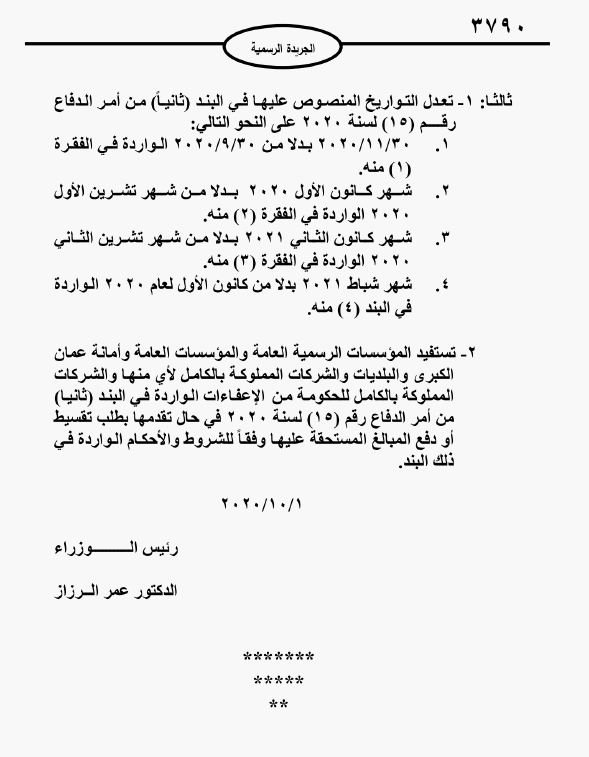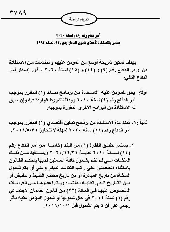 ويهدف أمر الدفاع الجديد إلى تمكين شريحة أوسع من المؤمن عليهم والمنشآت من الإستفادة من أوامر الدفاع رقم 9 و14 و15 لسنة 2020.