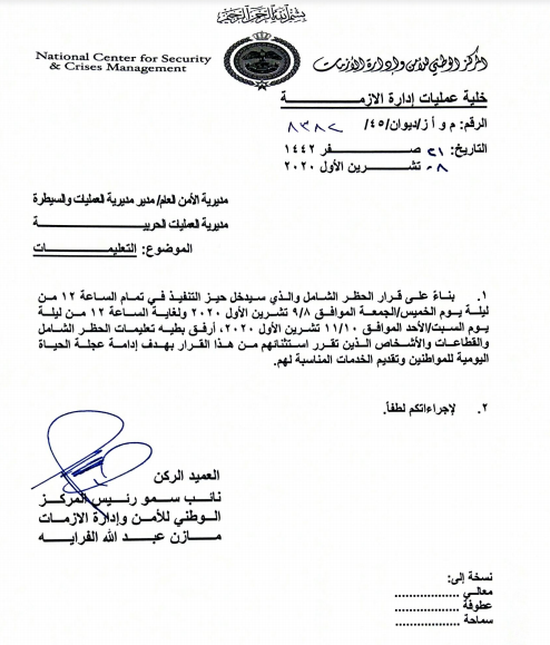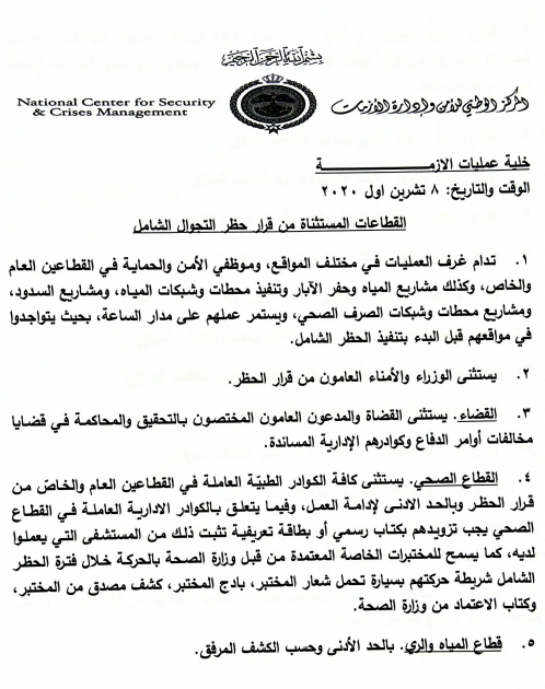 أحداث اليوم - أصدر المركز الوطني للأمن وادارة الأزمات توضيحاً لتعليمات الحظر الشامل، الذي دخل حيز التنفيذ اعتباراً من منتصف ليل الخميس الجمعة، ولغاية ليل السبت الأحد.