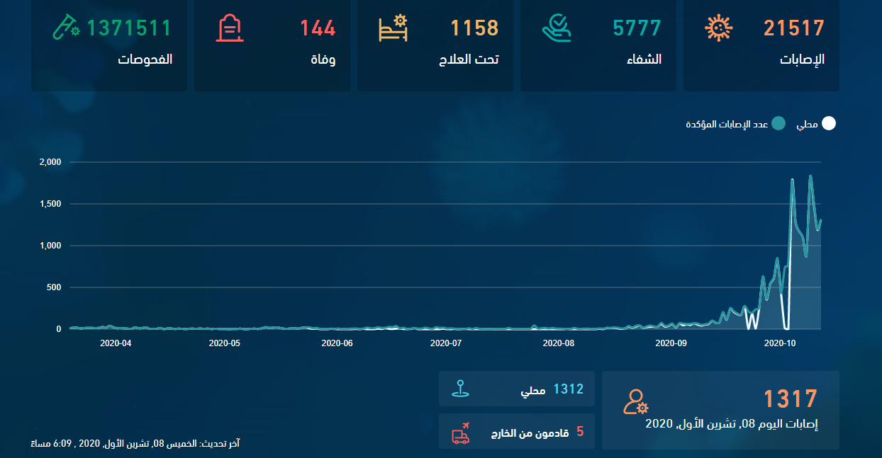 وحول عدد حالات الشفاء، وضحت الأرقام أنه بلغ عدد المتعافين من الفيروس منذ بداية الجائحة 5777 شخصاً، فيما وصل عدد الفحوصات المخبرية الإجمالية 1371511 فحصاً مخبرياً.