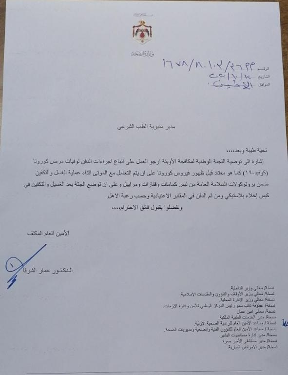 أحداث اليوم - قررت مديرية الطب الشرعي إعتماد دفن موتى كورونا في الأردن، بالطريقة العادية كما هو قبل ظهور فيروس كورونا.