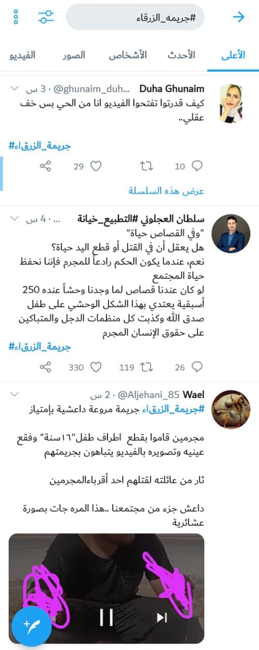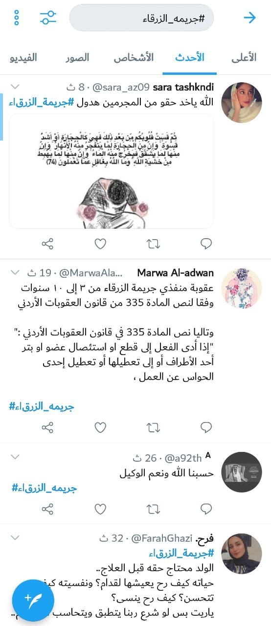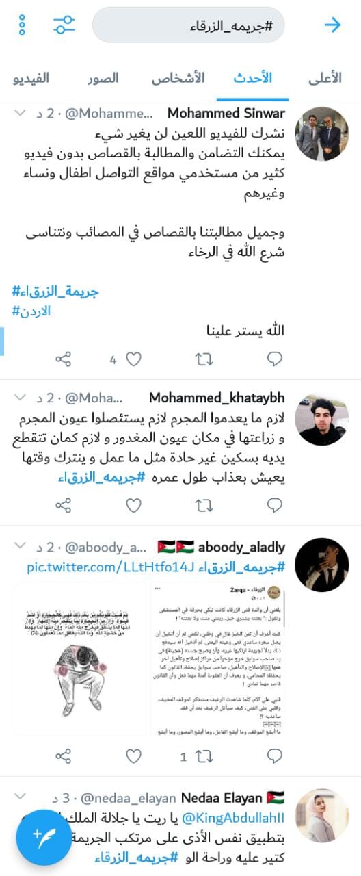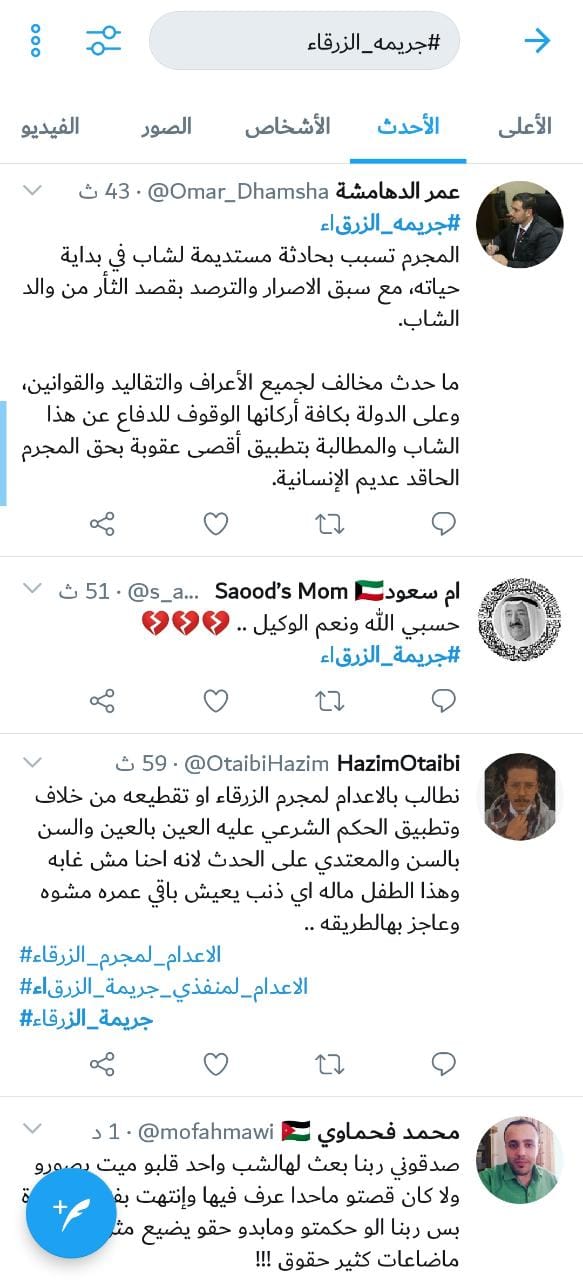 وطالب نشطاء على وسم #جريمة_الزرقاء الذي يتصدر الترند في الأردن، بإعدام الجناة واتخاذ أشد العقوبات بحقهم.