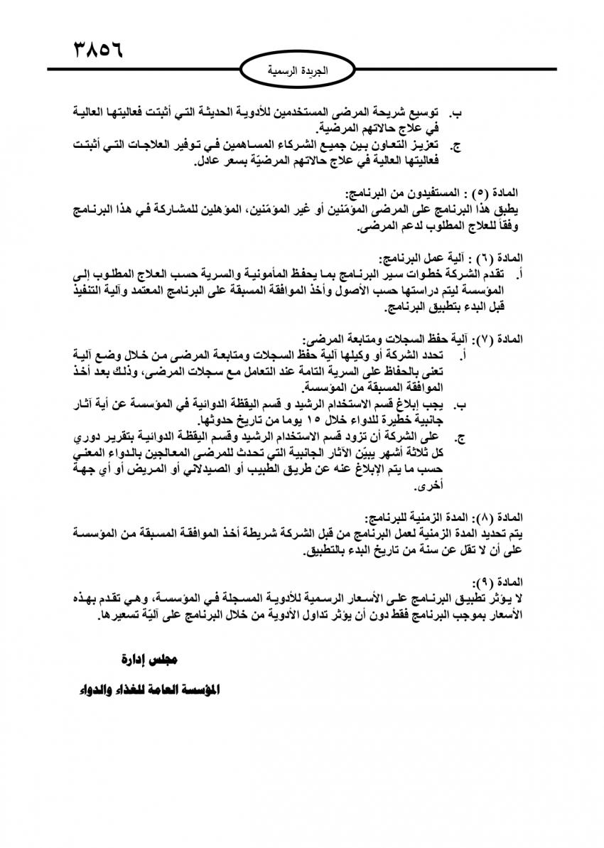 ويهدف البرنامج إلى دعم المرضى بتأمين الادوية بتكلفة مالية مناسبة، وتوسيع شريحة المرضى المستخدمين للأدوية الحديثة، وتعزيز التعاون بين جميع الشركاء المساهمين في توفير العلاجات التي اثبتت فعاليتها في علاج حالاتهم المرضية بسعر عادل.