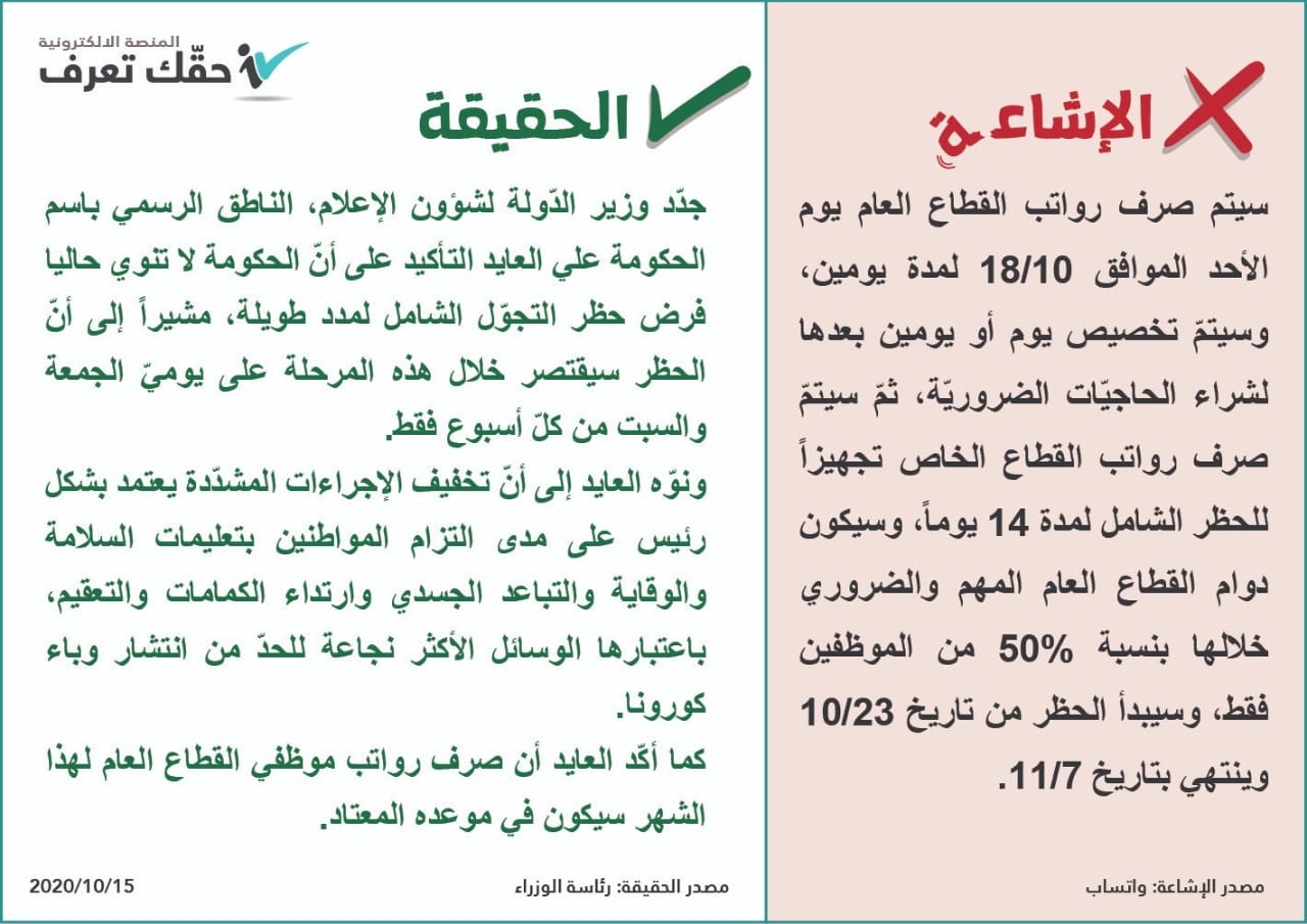 أحداث اليوم - أكد وزير الدولة لشؤون الإعلام الناطق باسم الحكومة علي العايد أنه لا صحّة للمعلومات المتداولة حول توجّه الحكومة لفرض حظر تجوّل شامل لمدّة 14 يوماً أو تقديم موعد صرف الرواتب.