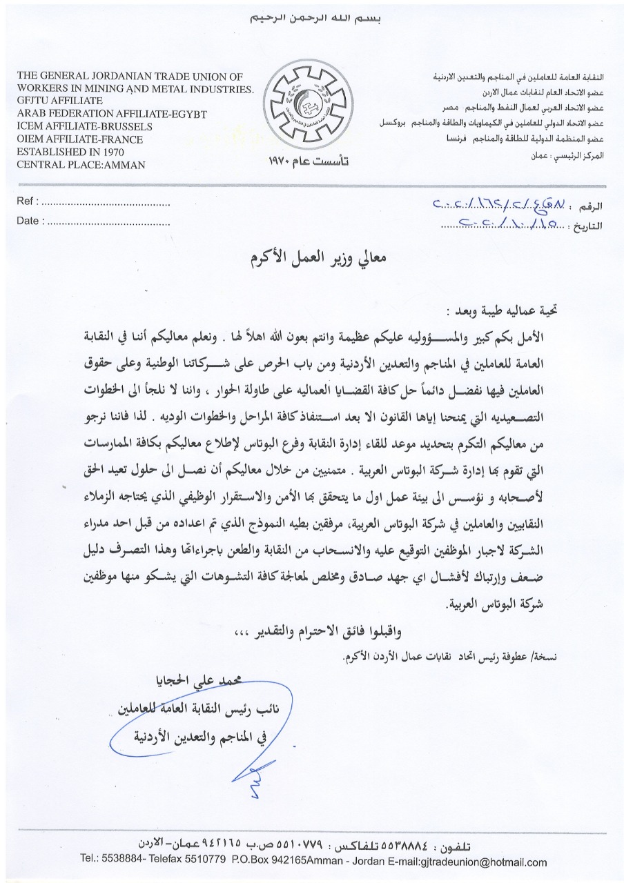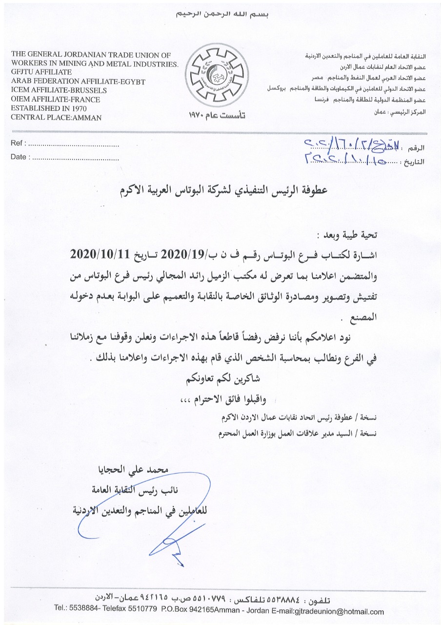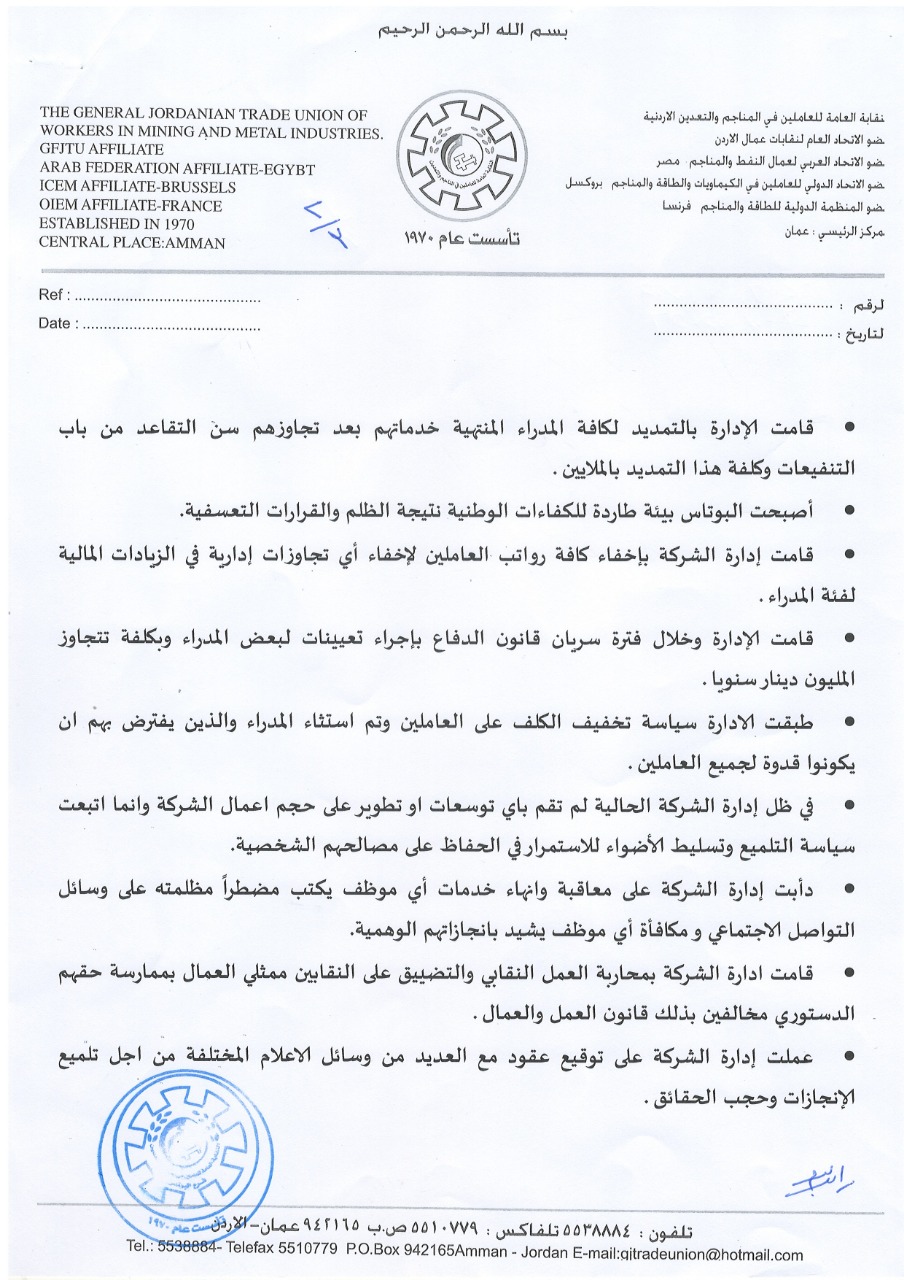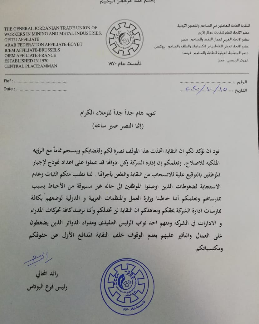الزملاء العاملين في شركة البوتاس العربية. عَلِمنَا أن عدد من المدراء وأدواتهم. يقوموا بالضغط عليكم وتهديدكم بأرزاقكم...