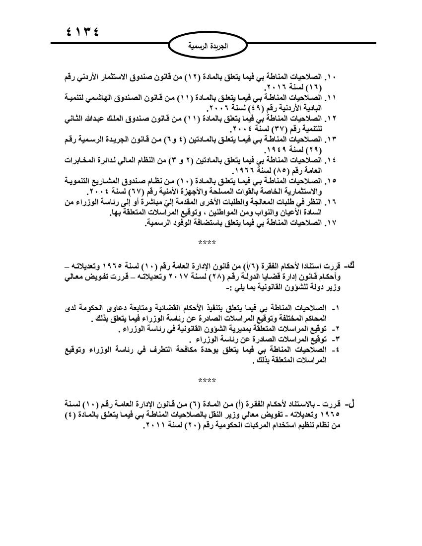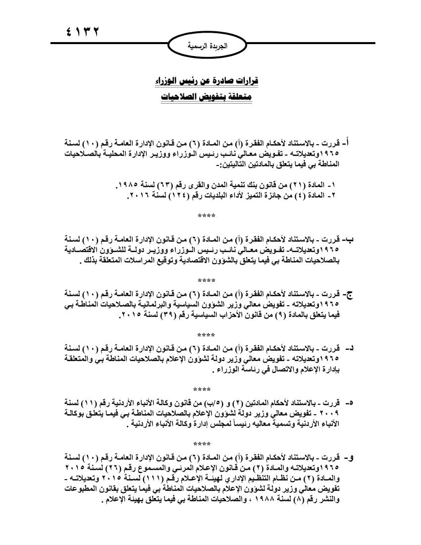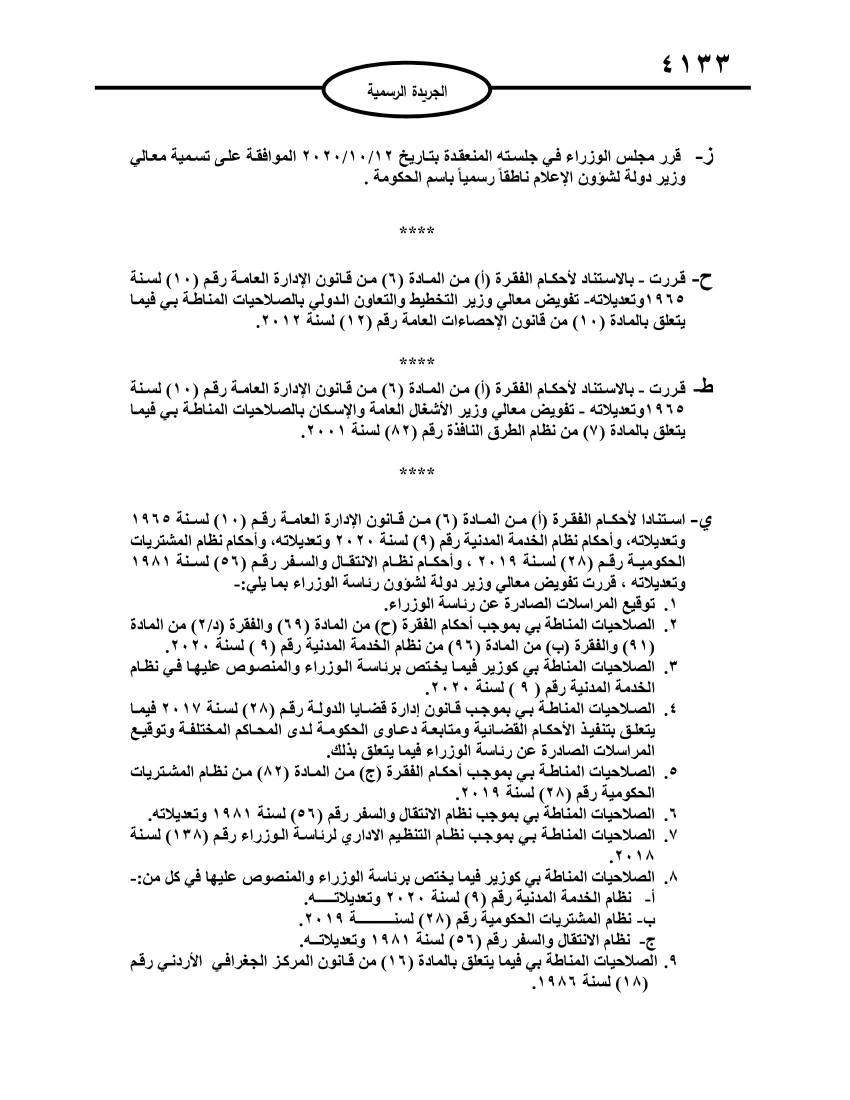 أحداث اليوم - قرر رئيس الوزراء الدكتور بشر الخصاونة تفويض عدد من الوزراء بالصلاحيات المناطة به، وفق عدد الجريدة الرسمية الصادر الثلاثاء.وتاليا التفويضات: