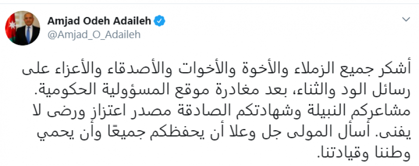 وقال العضايلة عبر تويتر الأربعاء، "أشكر جميع الزملاء والأخوة والأخوات والأصدقاء والأعزاء على رسائل الود والثناء، بعد مغادرة موقع المسؤولية الحكومية".