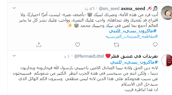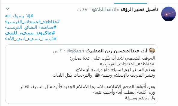 ودعا ناشطون إلى مقاطعة البضائع الفرنسية، ردا على إساءات فرنسا المتكررة وإهانة مليار ونصف مسلم حول العالم، بنشر صور مسيئة للنبي الكريم، ليس في المدارس والصحف، بل نشرها على المباني الكبيرة، مثل الصورة التي انتشرت مساء أمس من إحدى المباني في العاصمة باريس.