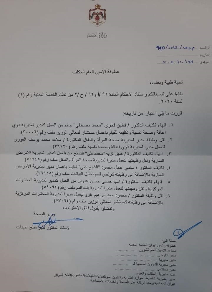أحداث اليوم - أجرى وزير الصحة نذير عبيدات، اليوم السبت، تشكيلات داخل وزارة الصحة هي الأولى منذ تسلمه الوزارة.وجاءت على النحو التالي: