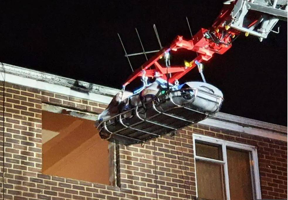 وأدى ذلك أخيرا إلى إجلائه من غرفة نومه في الطابق الثالث بواسطة رافعة ضخمة حتى يتمكن الأطباء من علاجه.
