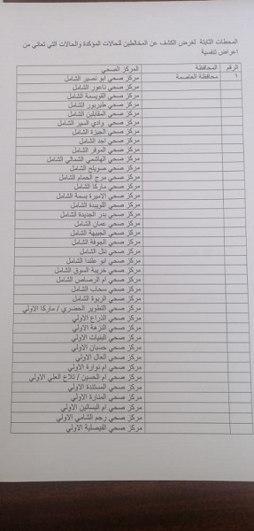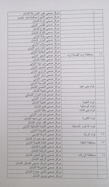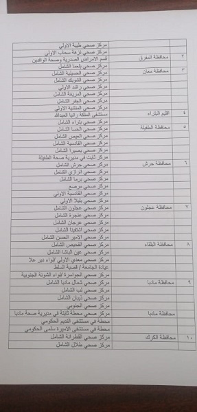 أحداث اليوم - أعلنت وزارة الصحة السبت عن المحطات الثابتة للكشف عن المخالطين للحالات المؤكدة والحالات التي تعاني من أعراض تنفسية.وتاليا المواقع ونقاط الفحص بحسب المحافظة والمركز الصحي: