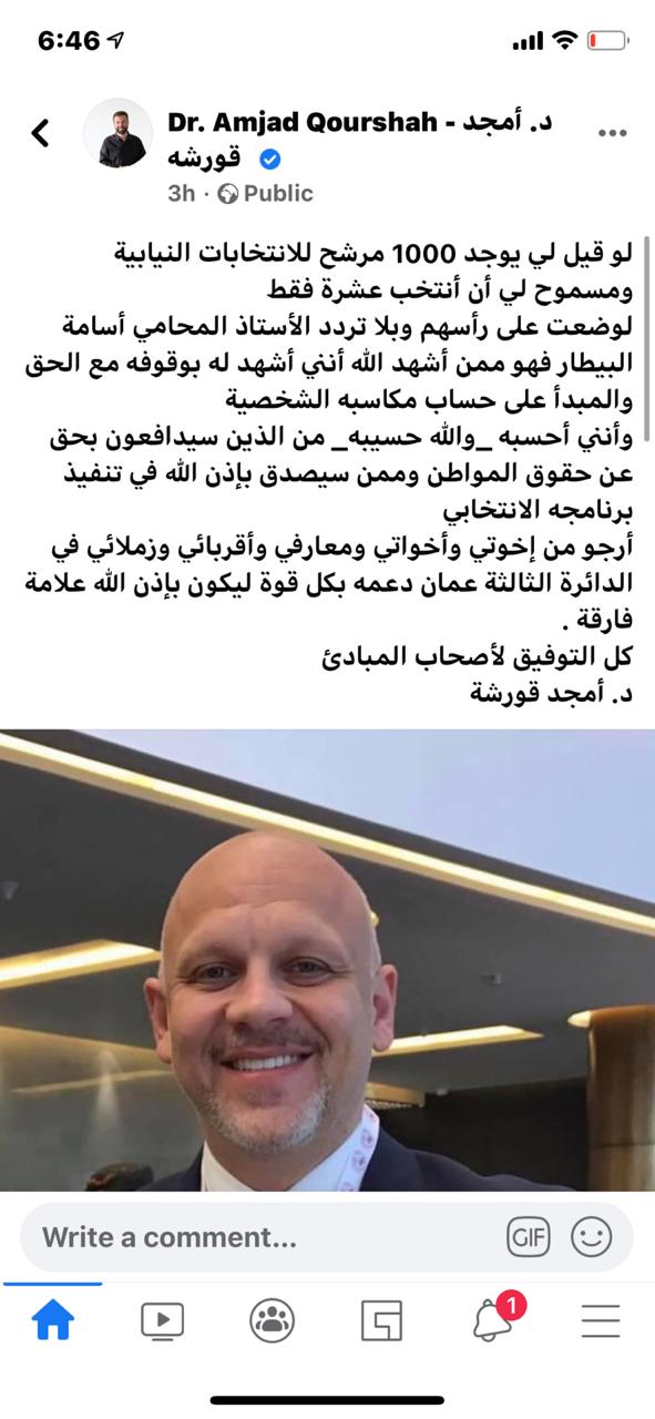 أرجو من إخوتي وأخواتي ومعارفي وأقربائي وزملائي في الدائرة الثالثة عمان دعمه بكل قوة ليكون بإذن الله علامة فارقة .