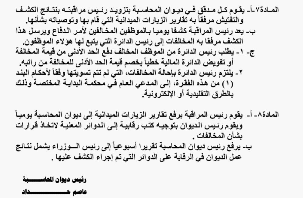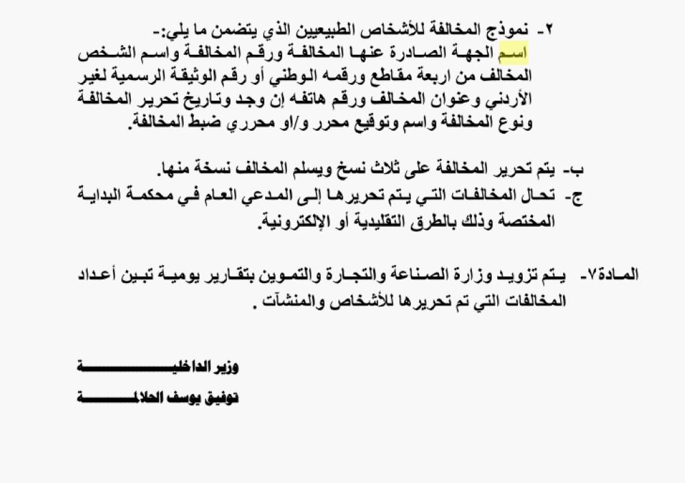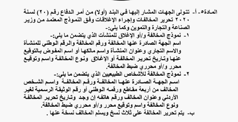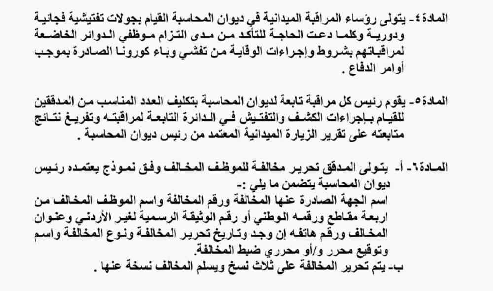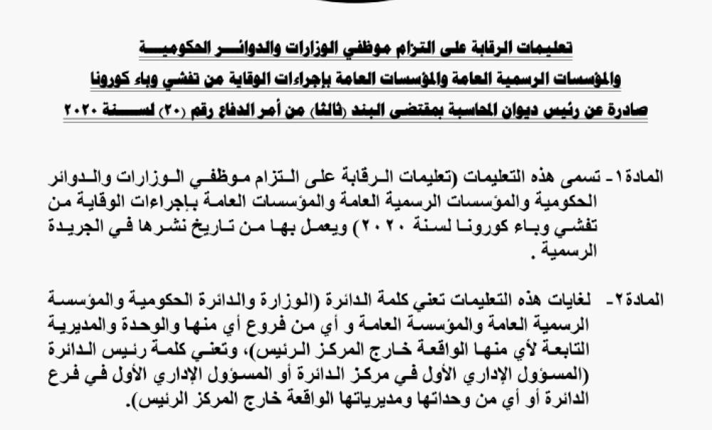 من جهته، أصدر رئيس ديوان المحاسبة تعليمات الرقابة على التزام موظفي الوزارات والدوائـــر الحكوميـــة والمؤسسات الرسمية العامة والمؤسسات العامة بإجراءات الوقاية من تفشي وباء كورونا.