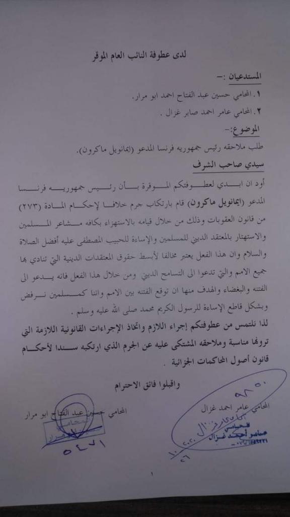 وقال المحاميان في عريضة الدعوى المدعو ماكرون قام بارتكاب جرم خلافا لاحكام المادة(273) من قانون العقوبات وذلك من خلال قيامه بالاستهزاء بكافة مشاعر المسلمين والاستهتار بالمتقد الديني للمسلمين والإساءة لرسول الله عليه افضل الصلاة والتسليم.