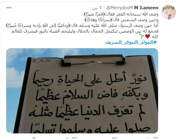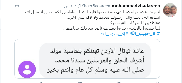 عشية الذكرى الشريفة أطلق ناشطون عبر مواقع التواصل الاجتماعي، وسماً جديد تحت اسم المولد النبوي الشريف في حين استمر آخرون بالنشر على الوسوم الخاصة بمقاطعة المنتجات الفرنسية والدفاع عن النبي محمد.