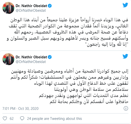 وكتب عبيدات في صفحته عبر موقع التدوينات القصير "تويتر"" في هذا الوباء خسرنا أرواحاً عزيزة علينا جميعاً من أبناء هذا الوطن الغالي، ويزيدنا ألماً فقدان مجموعة من الكوادر الصحية التي تقف دفاعاً عن صحة المرضى في هذه الظروف العصيبة، رحمهم الله وأسكنهم فسيح جنانه ويسر لأهلهم وذويهم سبل الصبر والسلوان و "إنا لله وإنا إليه راجعون"