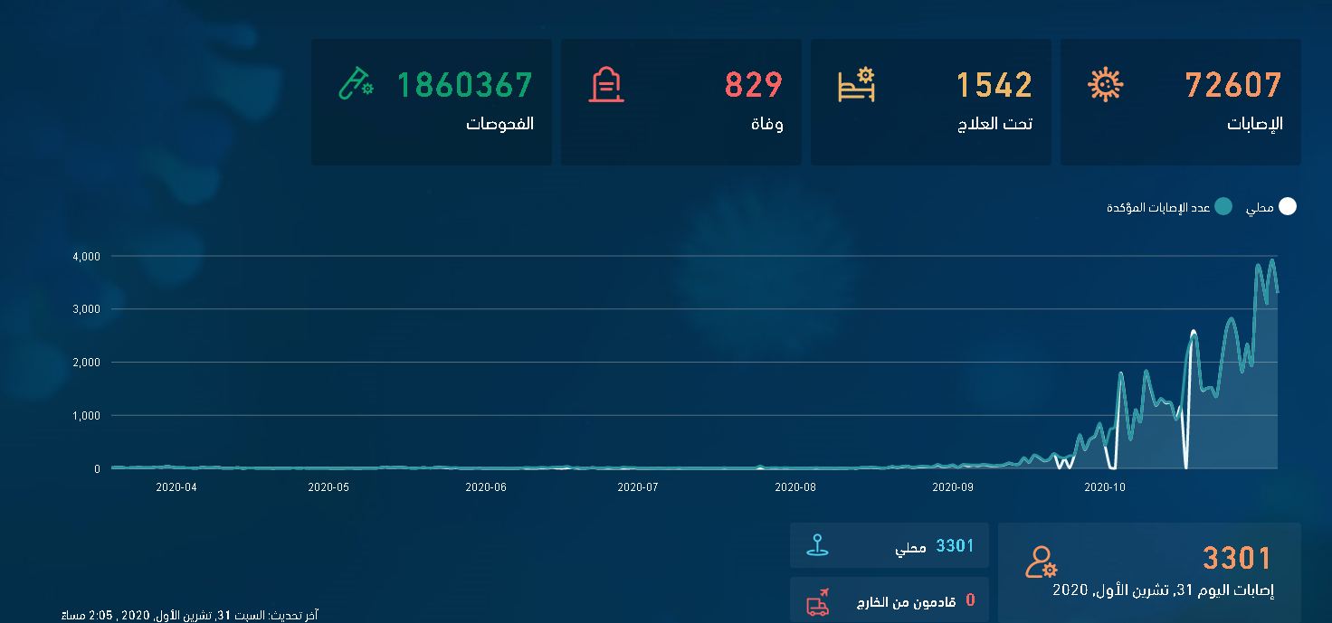 كما بينت الأرقام أن عدد المصابين الخاضعين للعلاج بالمستشفيات وصل إلى 1542 مصاباً، منهم 274 على أسرّة العناية الحثيثة، فيما وصل عدد الفحوصات المخبرية الإجمالي إلى 1860367 فحصاً مخبرياً.