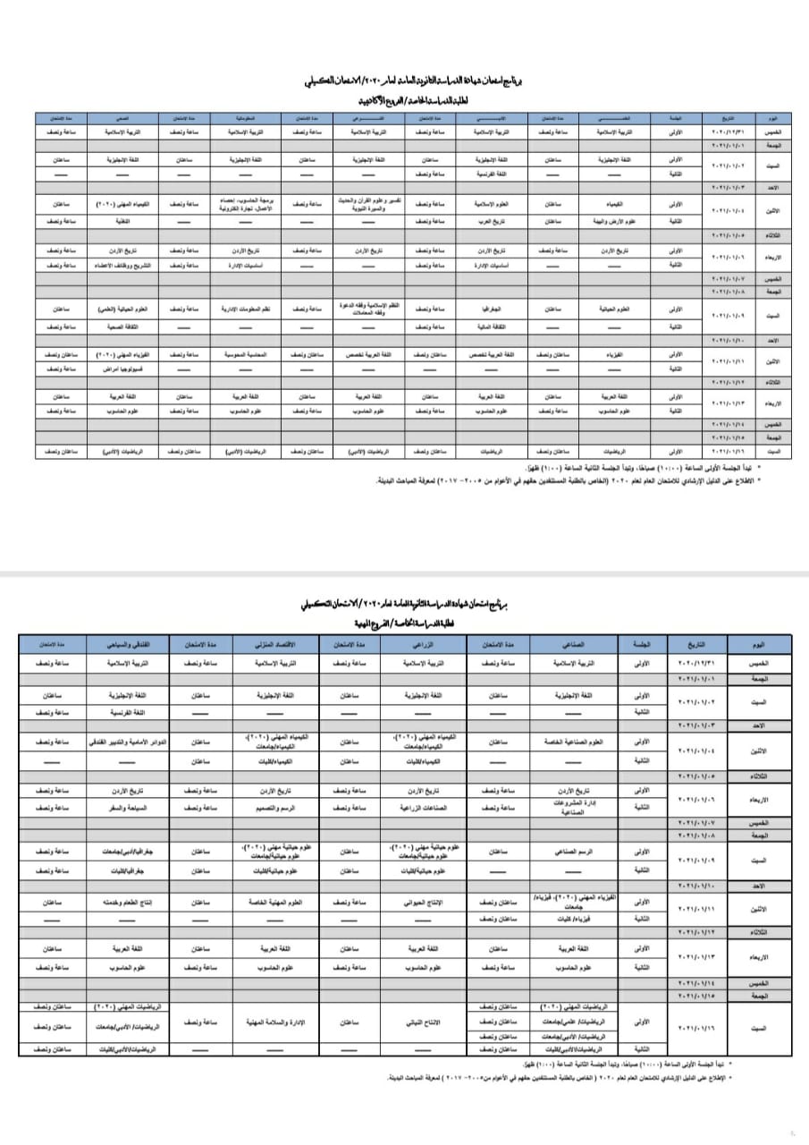 أحداث اليوم - أعلنت وزارة التربية والتعليم برنامج الامتحان التكميلي لعام 2020 للفروع الأكاديمية والمهنية للطلبة النظاميين (سابقًا) وطلبة الدراسة الخاصة بعد أن أقرته لجنة الامتحان العام، ووفق البرنامج سيبدأ الامتحان يوم الخميس 3١/ 12/ ٢٠٢٠ وينتهي يوم السبت 16/ 1/ 2021.