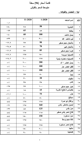 أحداث اليوم - أعدت "حماية المستهلك" دراسة مقارنة ميدانية تناولت التغيرات التي طرأت على أسعار السلع في بداية العام 2020 بالمقارنة مع أسعارها مع شهر 11/2020 وشملت الدراسة قراءة أسعار 96 سلعة.