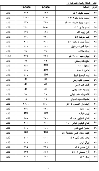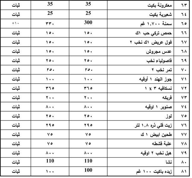 كما اظهرت الدراسة ثبات أسعار الارز والشاي والسكر والبقوليات والحليب والالبان والاجبان والزيوت النباتية والمعلبات.