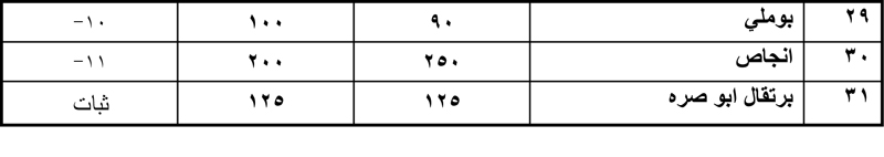 أما بالنسبة للفواكه فقد انخفض سعر الموز البلدي بنسبة بلغت 32% ، وثبات اسعار التفاح المستورد والموز المستورد والبرتقال.