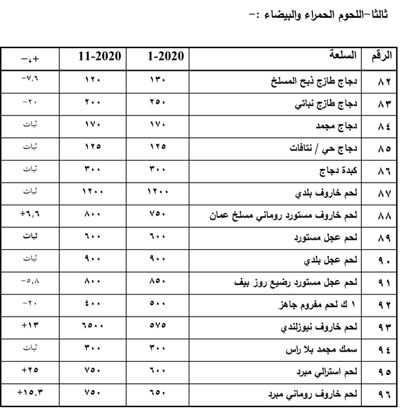 لحم الخاروف الاسترالي 25%% لحم خاروف روماني مبرد بنسبة بلغت 15.3% ولحم الخاروف النيوزلندي 13%، ولحم الخاروف الروماني ذبح المسلخ6.6%، لحم العجل المستورد 8.3% وثبات أسعار اللحوم البلدية.