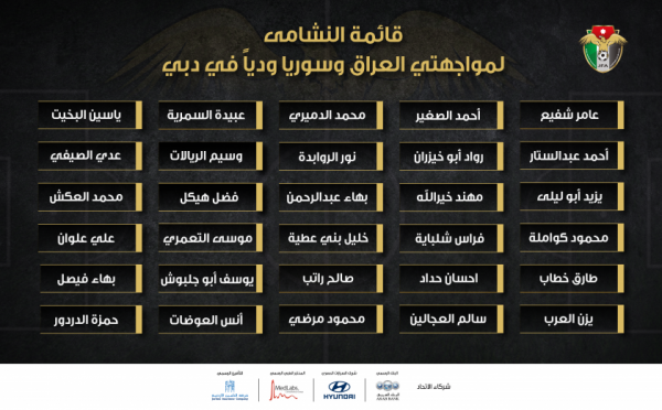 وضمت القائمة التي صدرت اليوم الاثنين 2 تشرين الثاني: عامر شفيع، أحمد عبد الستار، يزيد ابو ليلى، محمود الكواملة، طارق خطاب، يزن العرب، أحمد الزغير، رواد أبو خيزران، مهند خيرالله، فراس شلباية، إحسان حداد، سالم العجالين، محمد الدميري، نور الروابدة، بهاء عبد الرحمن، خليل بني عطية، صالح راتب، فضل هيكل، وسيم الريالات، محمود مرضي، عبيدة السمرية، موسى التعمري، يوسف أبو جلبوش، أنس العوضات، ياسين البخيت، عدي الصيفي، محمد العكش، علي علوان، بهاء فيصل وحمزة الدردور.