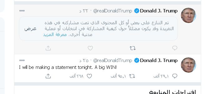أحداث اليوم - حذر موقع تويتر للرسائل القصيرة مستخدميه الأربعاء من رسالة كتبها على منصته دونالد ترمب اتهم فيها منافسيه الديموقراطيين بمحاولة "سرقة" الانتخابات الرئاسية بينما ما زالت نتائج الاقتراع غير مؤكدة.