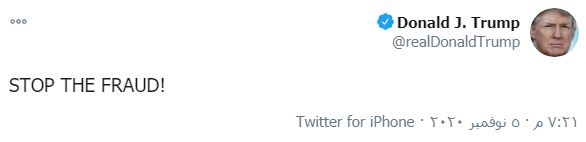 أحداث اليوم - غرد الرئيس الامريكية دونالد ترامب عبر تويتر قائلا:" اوقفوا التزوير، وذلك بعد ان طلب وقف فرز الاصوات متهما الديمقراطيين بالتزوير.