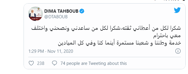 أحداث اليوم - وجهت النائب السابق ديما طهبوب رسالة الى متبايعها عبر موقع تويتر ، بعد ارقام أولية تشير الى خسارتها في الانتخابات النيابية.