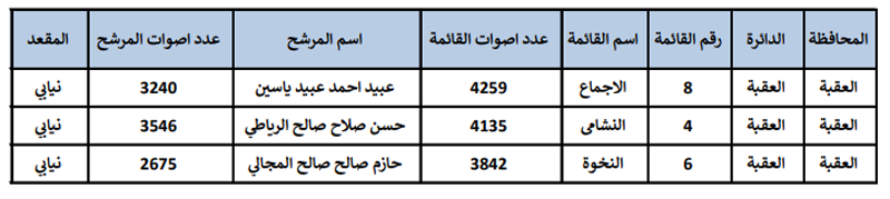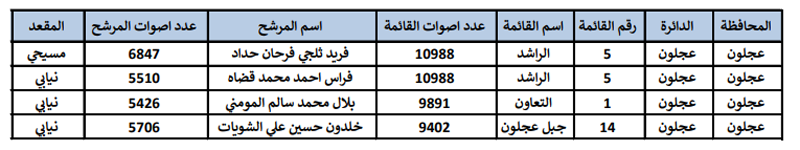 استنادا لأحكام الفقرة ( أ ) من المادة ( 50) من قانون الانتخاب لمجلس النواب رقم (6) لسنة 2016، وبعد أن فرغت اللجان الخاصة من تدقيق نتائج جميع الدوائر الانتخابية في المملكة ، وبعد أن رفعت اللجان نتائج اعمالها الى رئيس مجلس مفوضي الهيئة والذي يقام بعرضها على المجلس، حيث قرر المجلس اعتماد النتائج النهائية للانتخابات النيابية لأعضاء مجلس النواب التاسع عشر للعام 2020 على النحو التالي :