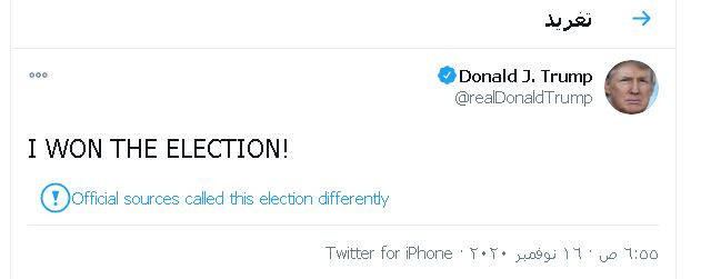أحداث اليوم - لا زال الرئيس الأميركي دونالد ترامب يثير الجدل بتغريداته عبر موقع التدوينات القصيرة تويتر ، وهذه المرة بتغريدة جديدة قال فيها : انا فزت بالانتخابات (I WON THE ELECTION!).