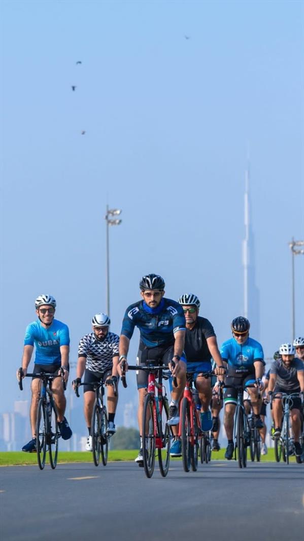 وأظهرت صور متداولة الشيخ حمدان مرتدياً الزي الرياضي ويقود دراجته برفقة عدد من رؤساء ومدراء الشركات العالمية، في مضمار رياضي بدبي.