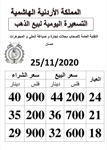وبحسب تسعيرة اليوم الأربعاء 25/11/2020 ، فان سعر غرام الذهب 21 قيراط انخفض الى 36.70 دينار مقارنة بـ 38.1 دينارا يوم الاثنين.