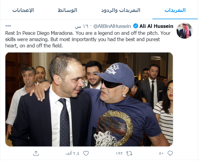 نعى سمو الأمير علي بن الحسين رئيس الإتحاد الأردني لكرة القدم عبر تغريدة له على موقع تويتر "جاء فيها: “إرقد بسلام دييغو مارادونا، أنت أسطورة داخل وخارج الملعب. كانت مهاراتك مذهلة. ولكن الأهم من ذلك كان لديك أفضل وأنقى قلب، داخل وخارج الملعب”.