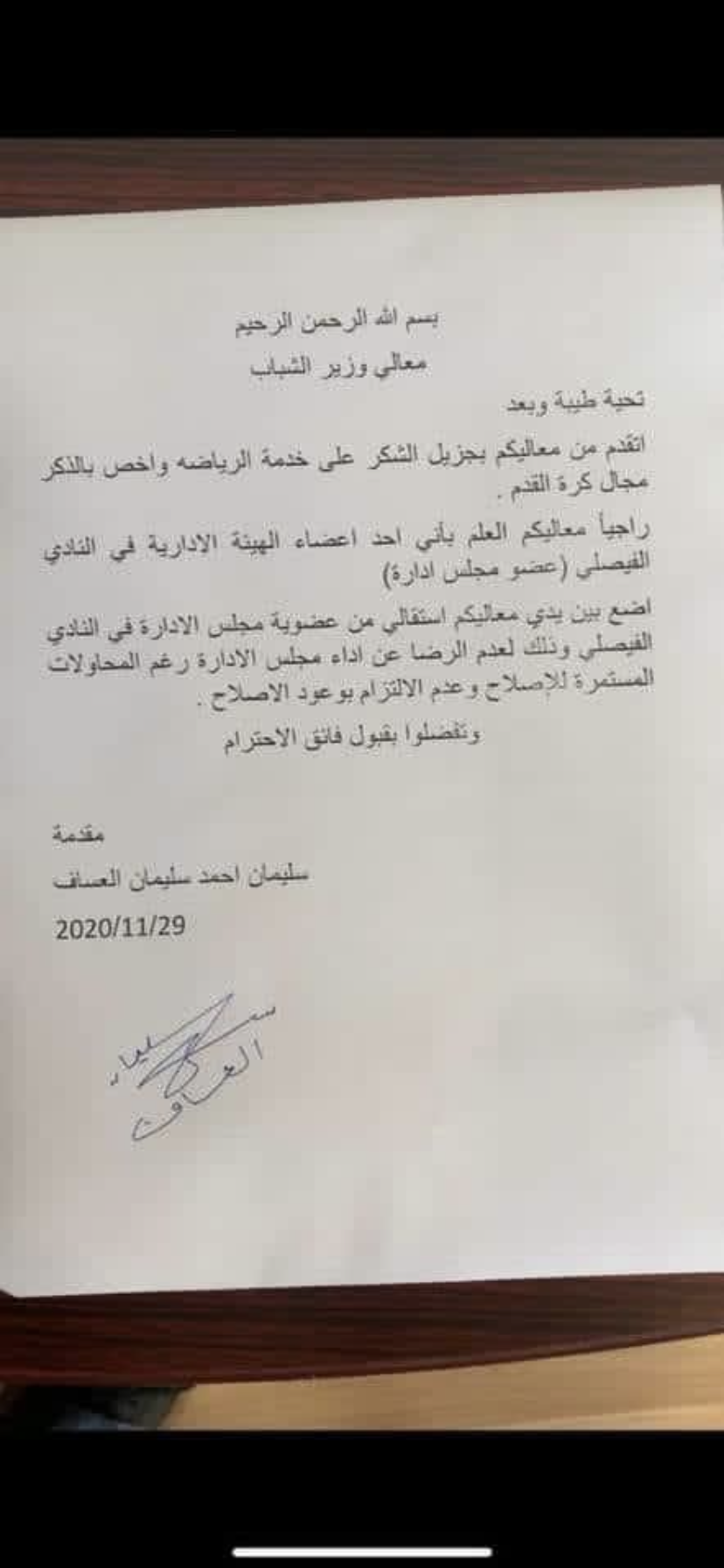 قدم سليمان العساف استقالته من عضوية مجلس ادارة النادي الفيصلي .
