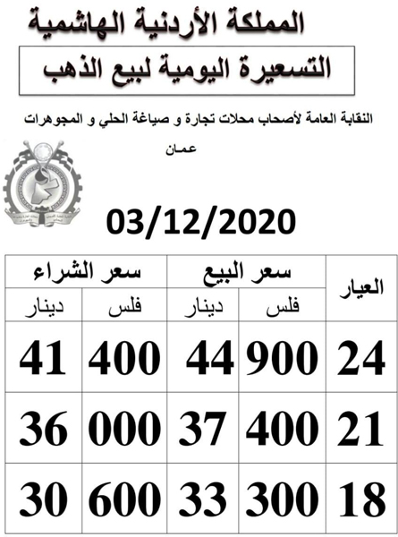 وبحسب التسعيرة الرسمية الصادرة الخميس 3/12/2020 عن النقابة العامة لأصحاب محلات تجارة وصياغة الحلي والمجوهرات بلغ سعر غرام الذهب عيار 21 الذي يعتبر الأكثر طلباً في السوق الأردني 37.4 دينارا للغرام.