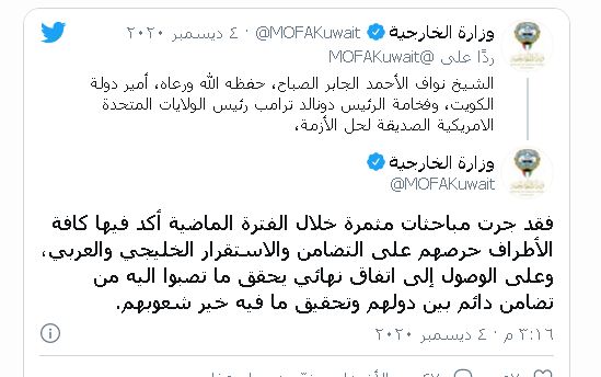 وقالت دولة الكويت إن المصالحة سوف تتم خلال اجتماع القمة الخليجية التي من المقرر أن تعقد في البحرين الشهر الجاري.