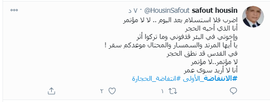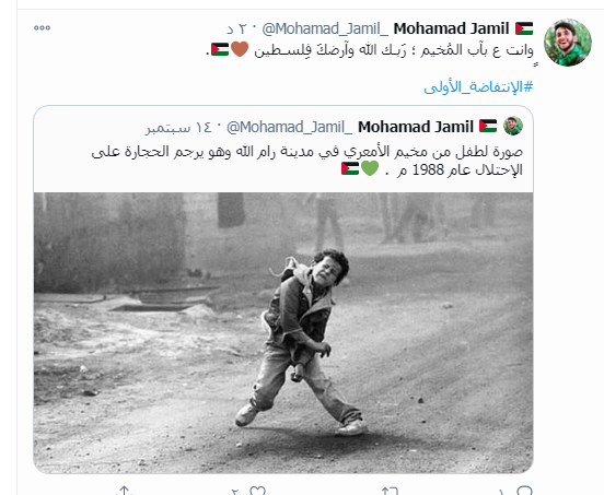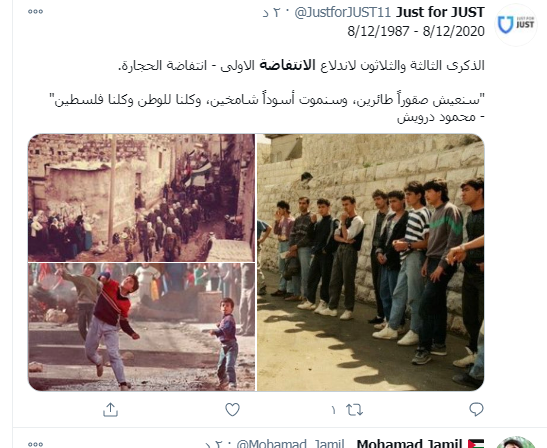 وعبر النشطاء عبر وسم #الانتفاضة_الاولى الذي دشنوه على مواقع التواصل، عن اصرارهم على الصمود والمقاومة بوجه المحل الغاصب، مؤكدين أن الحق في الأرض لا يسقط بالتقادم مهما طال الزمن، وأن طبّع كل العالم مع العدو.