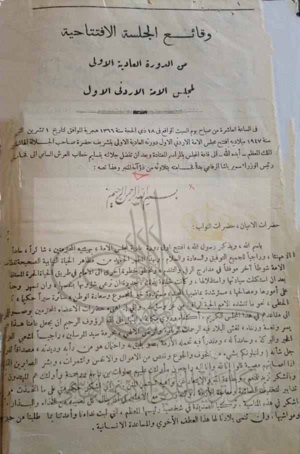 أحداث اليوم - نشر مركز التوثيق الملكي وثيقة خطاب العرش الأول أمام مجلس الأمة الأول عام 1947 في زمن الملك المؤسس الشهيد عبدالله الأول.