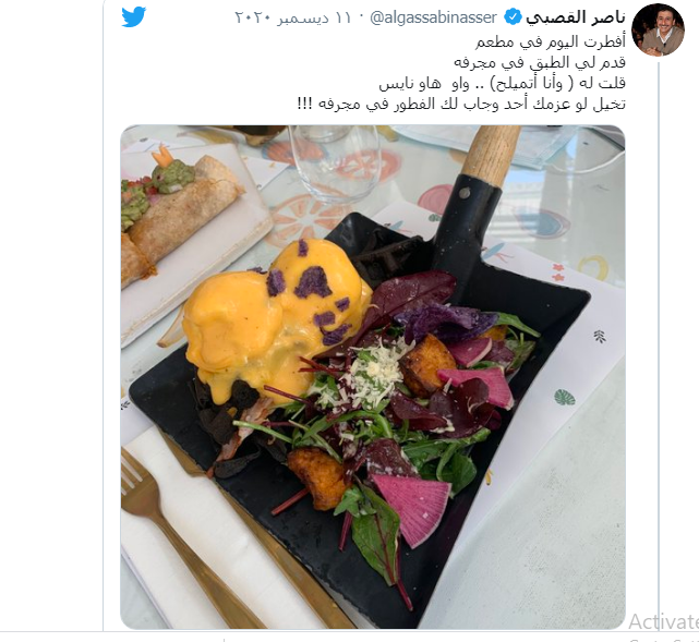 شارك القصبي متابعيه عبر حسابه بموقع "تويتر" صورة من تناوله وجبة فطور غير عادية في أحد المطاعم، بسبب تقديمها له بواسطة مجرفة.