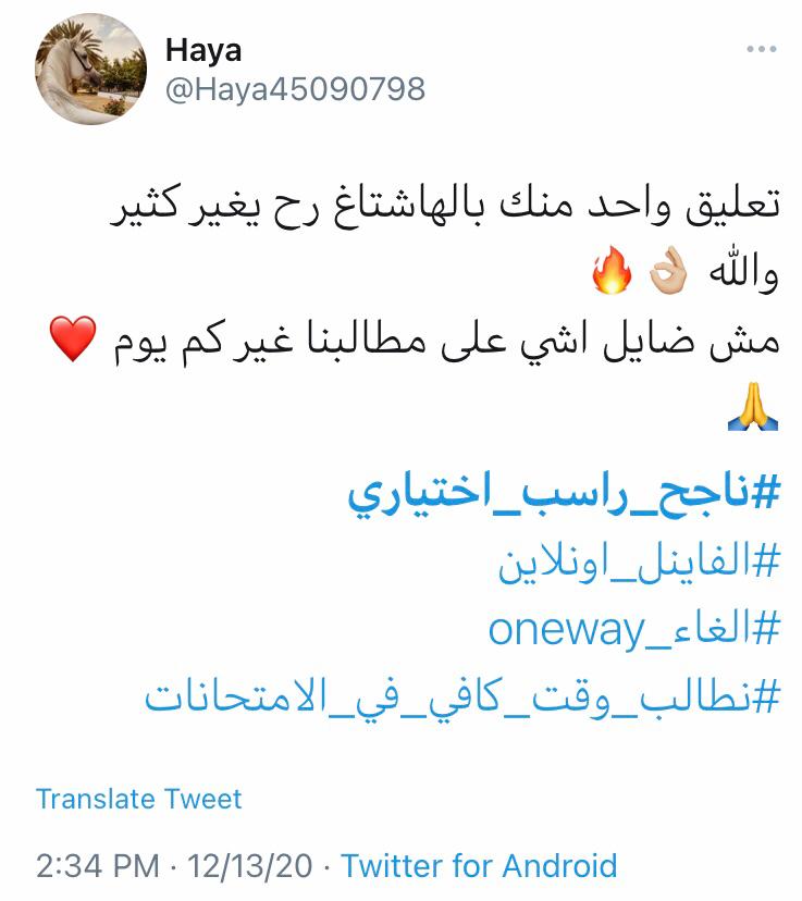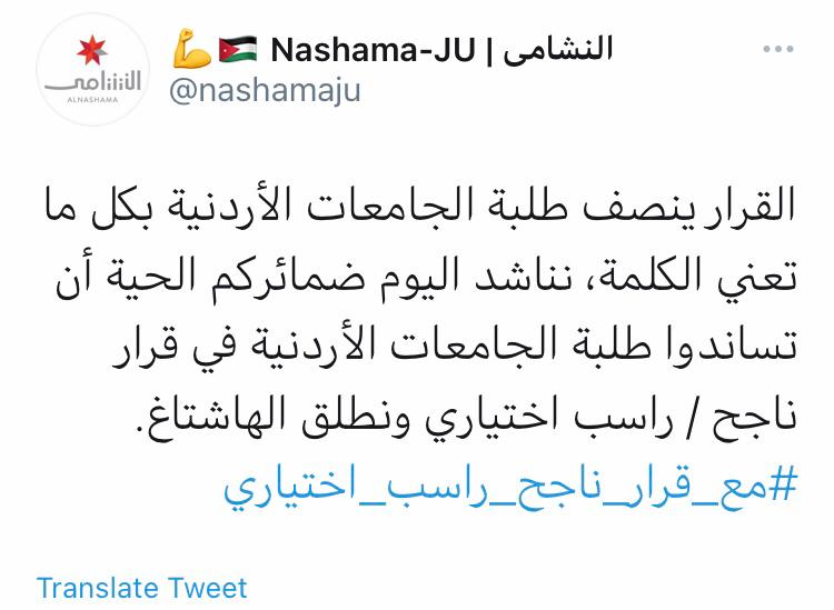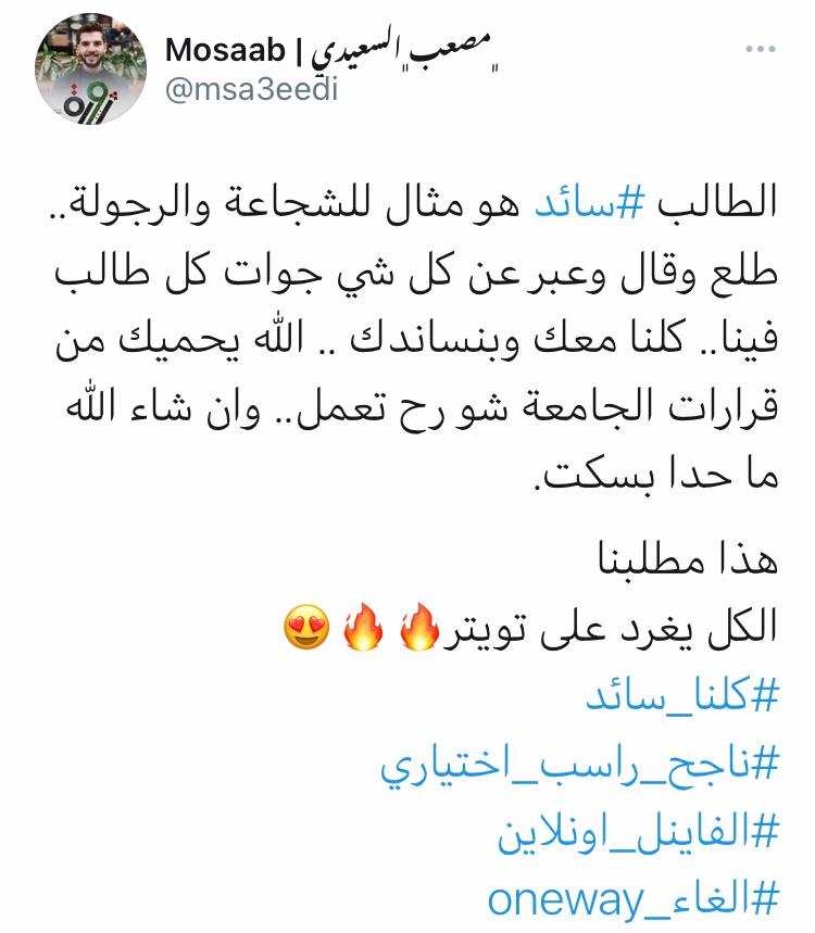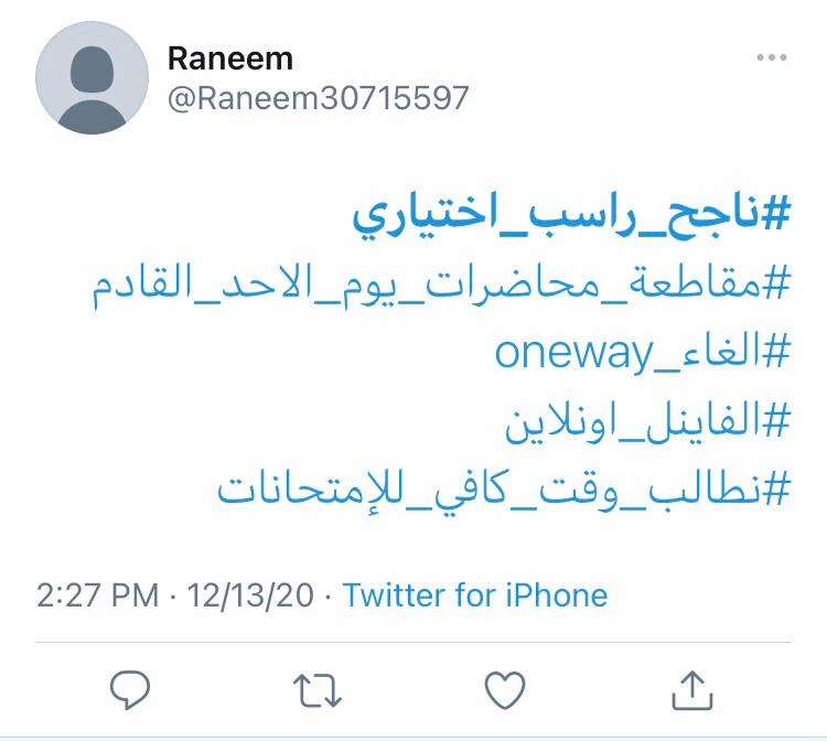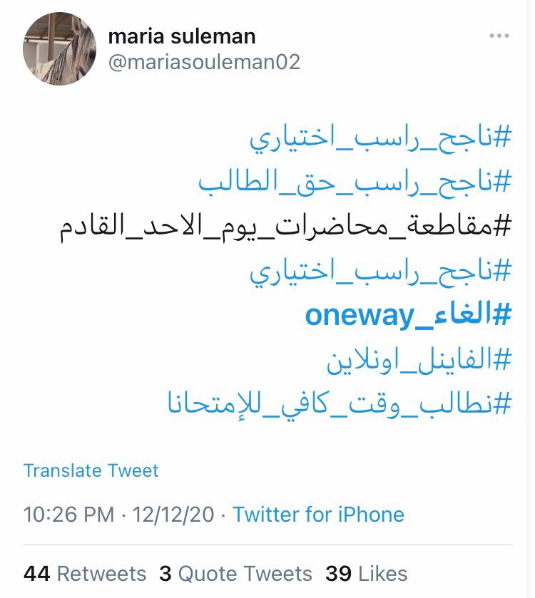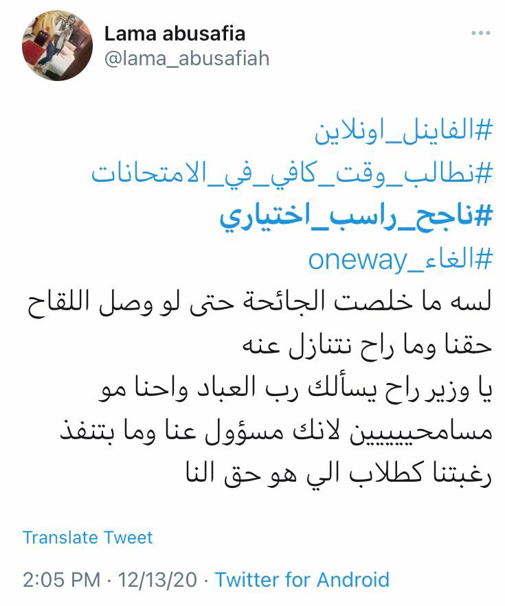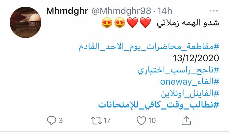 وتصدر هاشتاغ #ناجح_راسب_إختياري و #الفاينال_اونلاين في لأئحة الهاشتاغ على منصة توتير من الطلبة الأردنين معبرين عن مدى رفضهم لنظام (oneway) في اسئلة الإمتحانات من خلال وسام #الرجوع _للسؤال_من_ حقي.