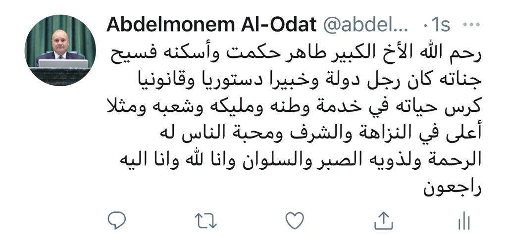 وكتب العودات في تغريدة له عبر موقع التواصل الاجتماعي تويتر: "رحم الله الأخ الكبير طاهر حكمت وأسكنه فسيح جناته، كان رجل دولة وخبيرا دستوريا وقانونيا كرس حياته في خدمة وطنه ومليكه وشعبه ومثلا أعلى في النزاهة والشرف ومحبة الناس له الرحمة ولذويه الصبر والسلوان وانا لله وانا اليه راجعون".