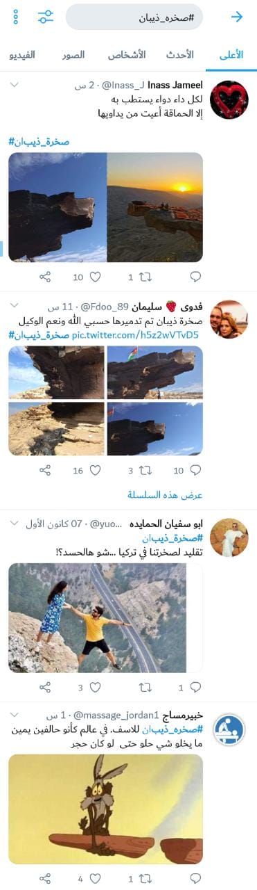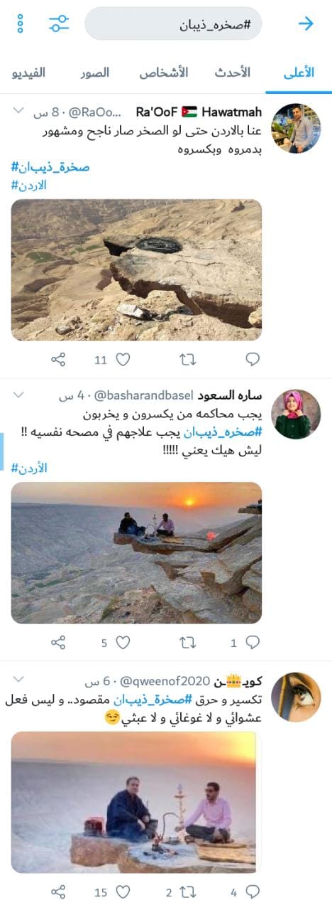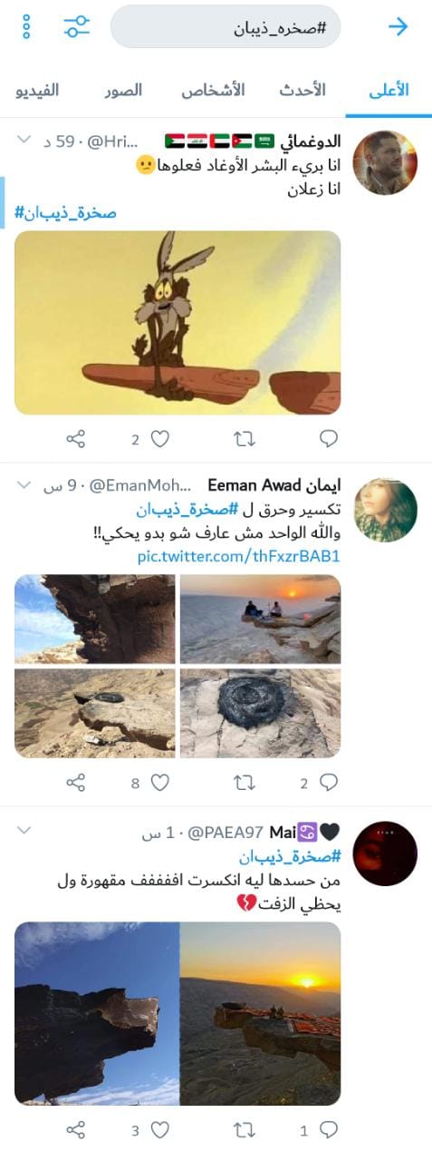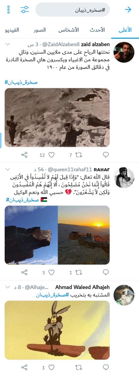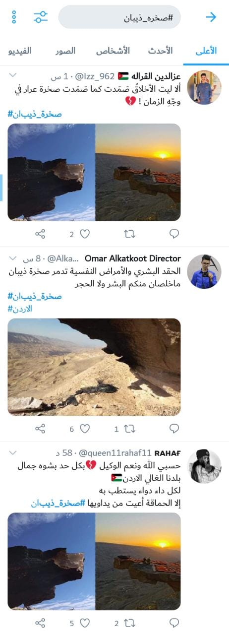 واعتبر النشطاء على وسم #صخرة_ذيبان، أن الاعتداء على الصخرة التي نالت شهرة كبيرة الفترة الماضية نظرا لاطلالتها الساحرة والفريدة، عمل مشين وجاء من قبل حاقدين وأشخاص مستهترين.
