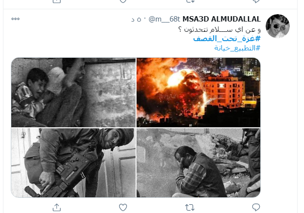 وتسائل النشطاء عن اتفاقات التطبيع العربي مع الإحتلال وعن نتائجها، ولماذا لا يتحرك المطبعون استنكاراً بعد هذا القصف الغاشم.
