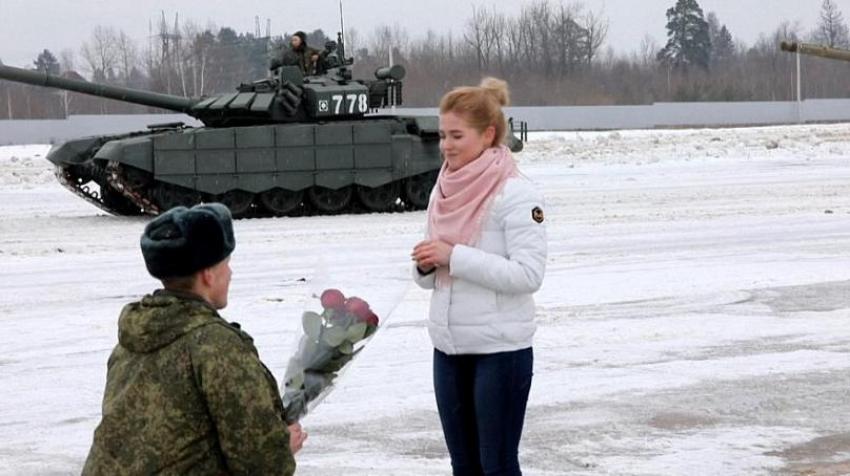 اختار ضابط في الجيش الروسي الاحتفال بعيد الحب بطريقة مميزة، فأحاط نفسه بست عشرة مدرعة من نوع "تي-72 بي 3" اصطفت على شكل قلب بهدف طلب يد حبيبته للزواج.