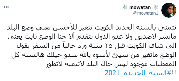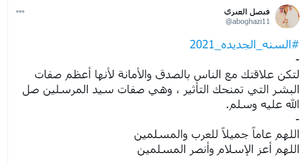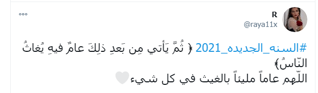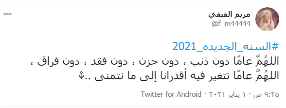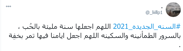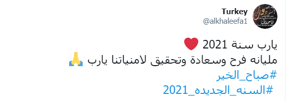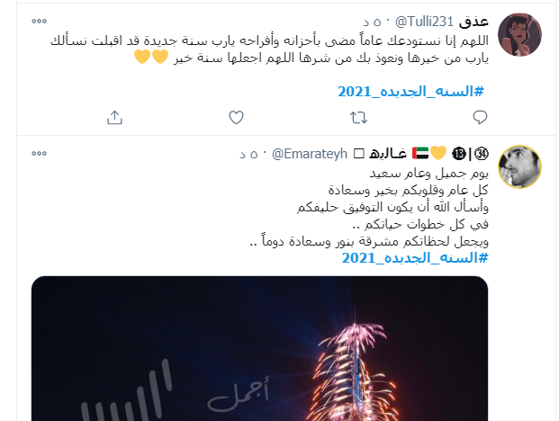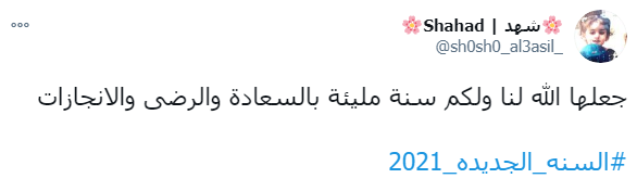 ودشن النشطاء وسم #السنه_الجديده_2021 ليكون في قائمة الترند على تويتر، حيث عبر النشطاء والرواد من خلاله تمنياتهم بان يكون العام الجديد أفضل وأكثر سعادة وبركة.