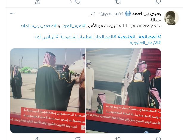 وركز النشطاء على لحظات العناق بين امير دولة قطر الامير تميم، وولي العهد السعودي محمد بن سلمان، عند وصول الامير تمام الى السعودية.