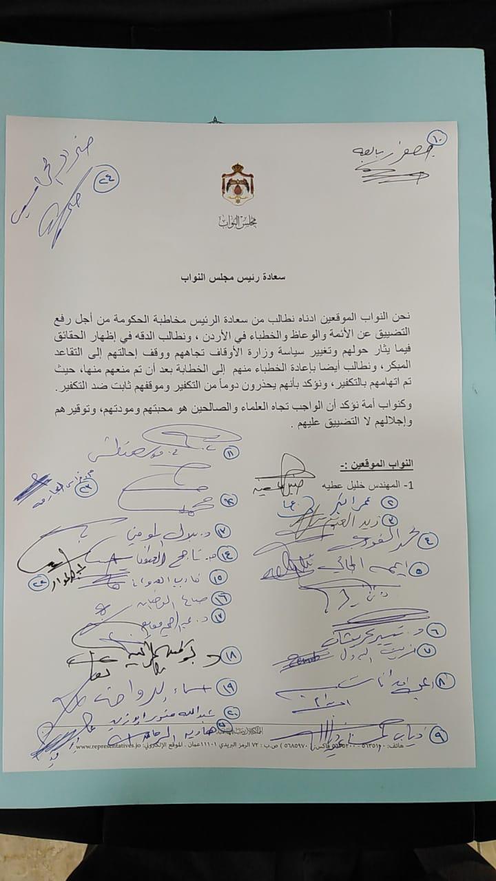 نحن النواب الموقعين ادناه نطالب من سعادة الرئيس مخاطبة الحكومة من أجل رفع التضييق عن الأئمة والوعاظ والخطباء في الأردن ، ونطالب الدقه في إظهار الحقائق فيما يثار حولهم وتغيير سياسة وزارة الأوقاف تجاههم ووقف إحالتهم إلى التقاعد المبكر، ونطالب أيضا بإعادة الخطباء منهم إلى الخطابة بعد أن تم منعهم منها، حيث تم اتهامهم بالتكفير، ونؤكد بأنهم يحذرون دوماً من التكفير وموقفهم ثابت ضد التكفير.