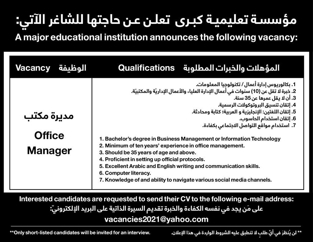أحداث اليوم - مطلوب مديرة مكتب بالمؤهلات والخبرات التالية: